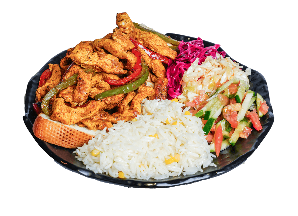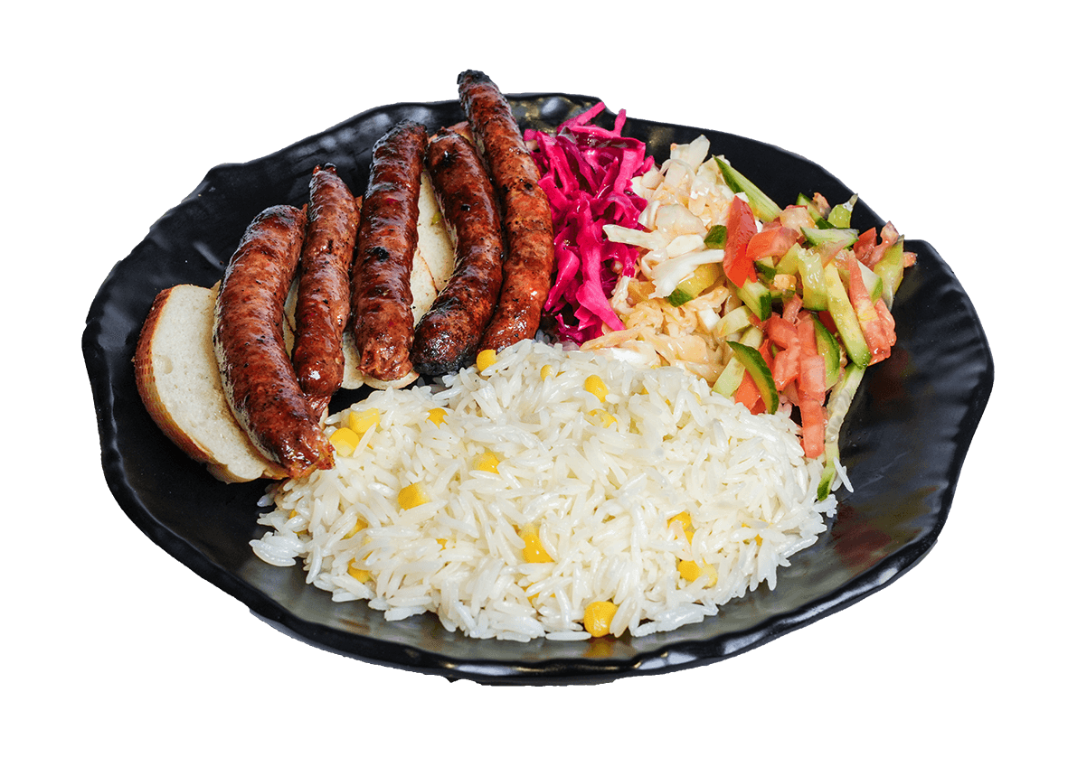 طبق كباب مشوي يُقدَّم مع أرز وسلطات متنوعة.